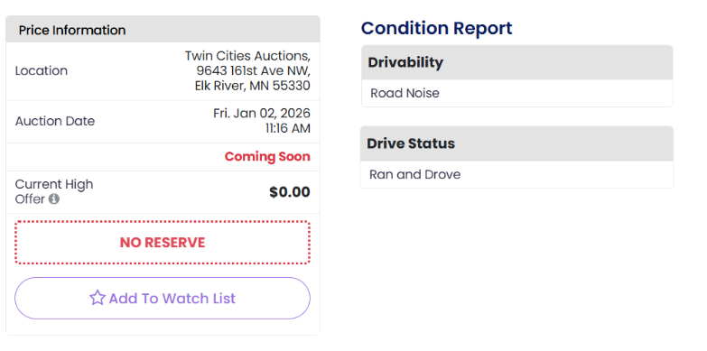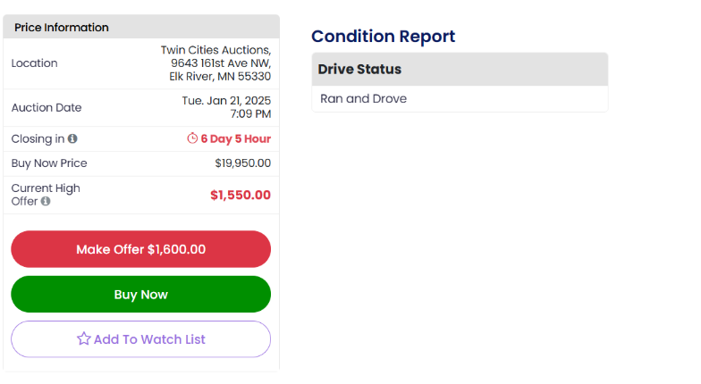 - Consejos para la Subasta: Revisa señales de desgaste y asegúrate de que el vehículo tenga un título limpio.