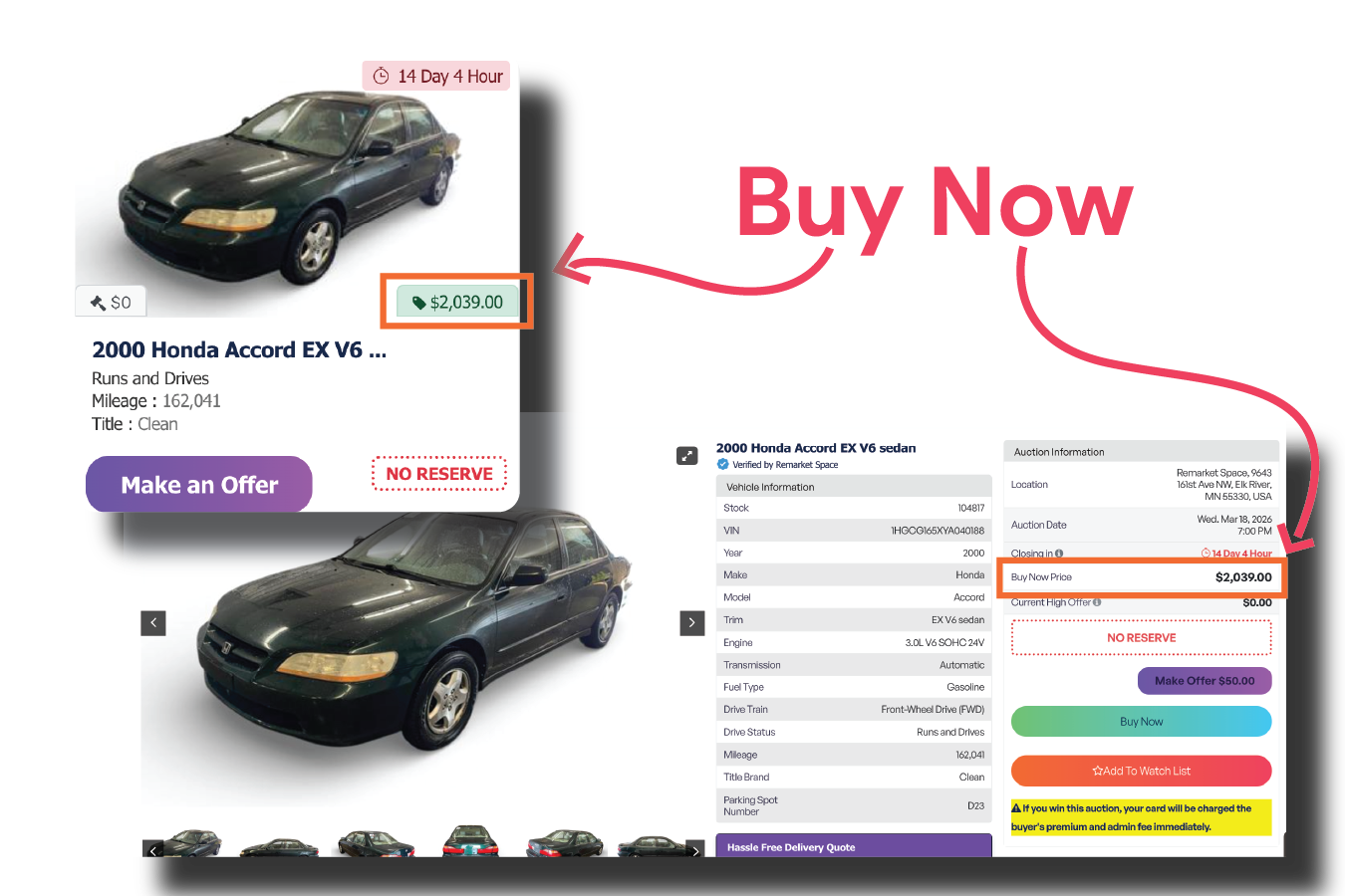 This allows a buyer to skip the auction process and purchase the vehicle immediately at the listed price (plus closing fees).