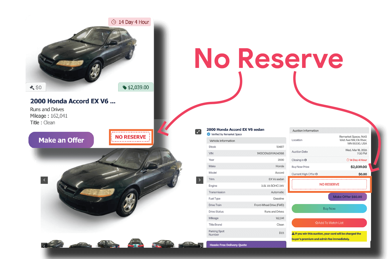 A No Reserve auction means the vehicle will sell to the highest bidder regardless of price. These are marked on the listings and thumbnails of the vehicles as seen above.