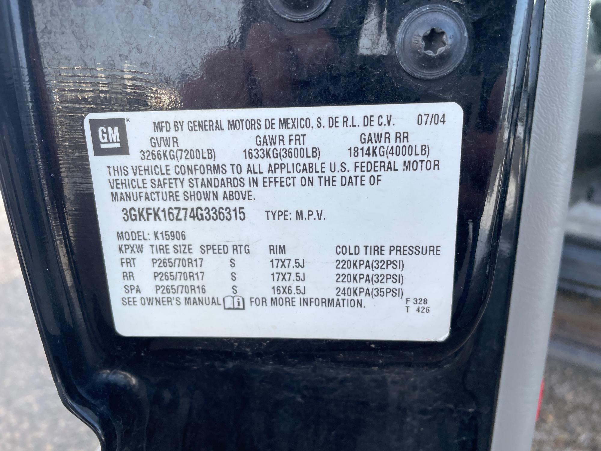 | VIN | 3GKFK16Z74G336315 |