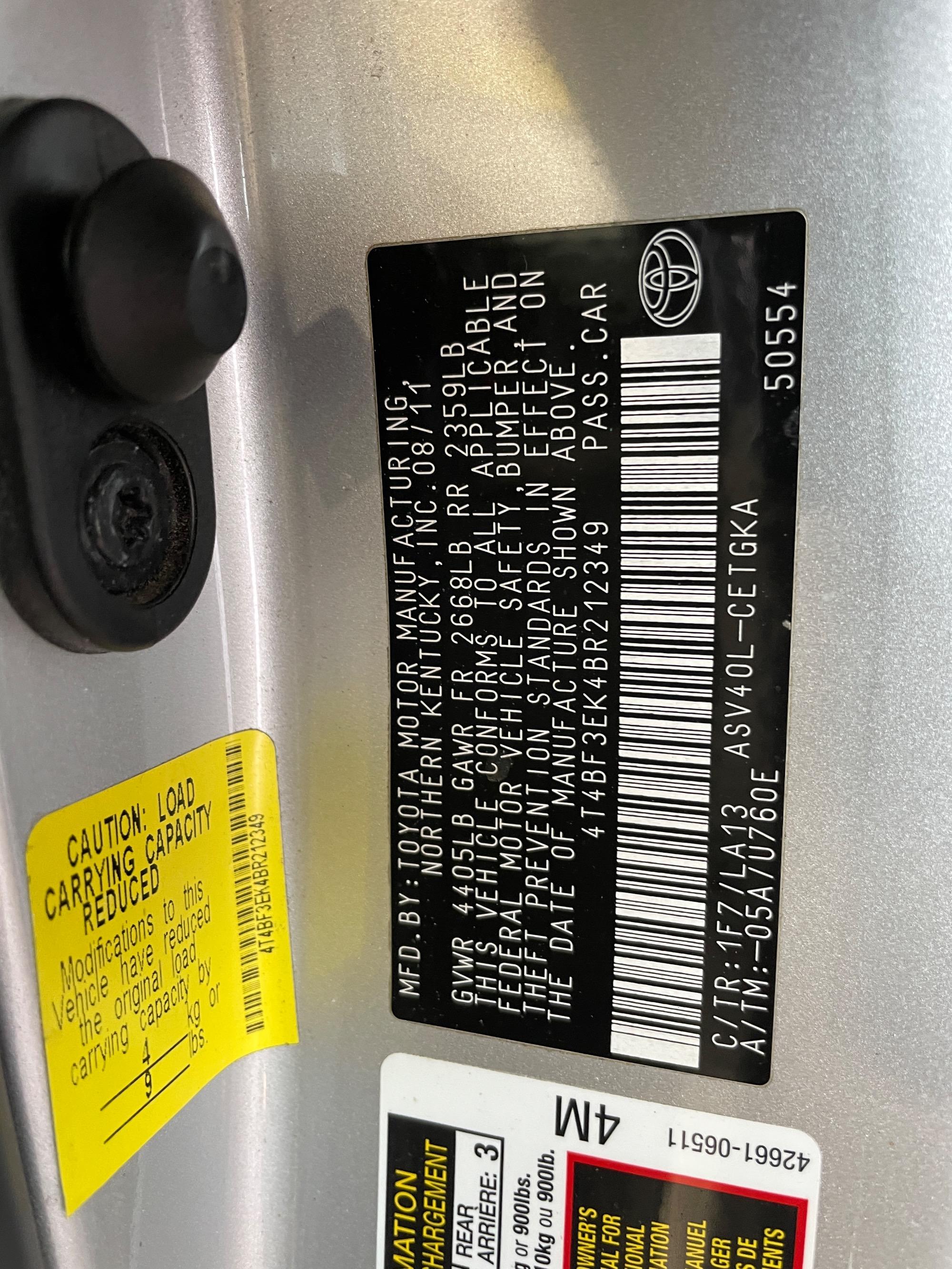 | VIN | 4T4BF3EK4BR212349 |