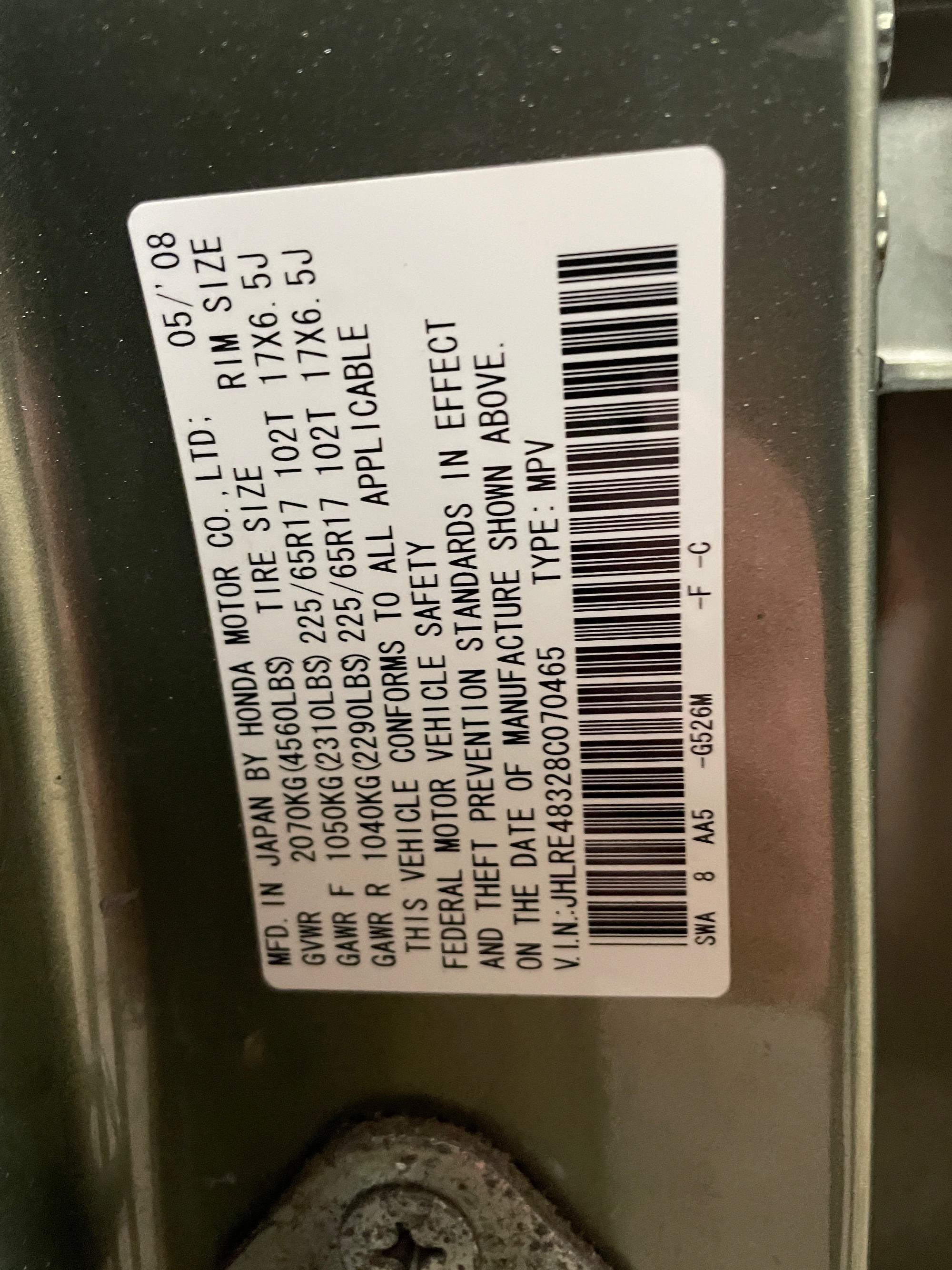 | VIN | JHLRE48328C070465 |