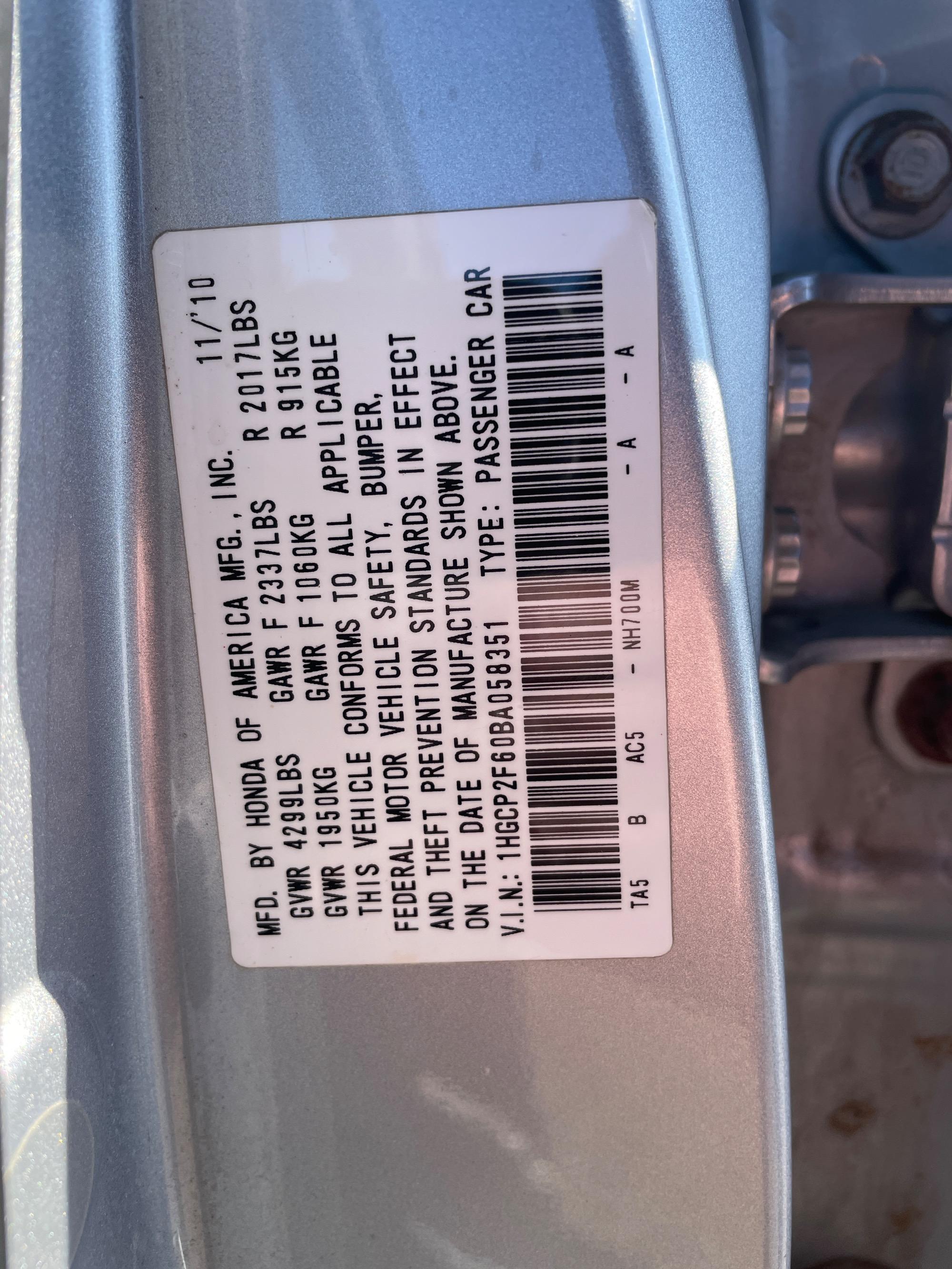| VIN | 1HGCP2F60BA058351 |