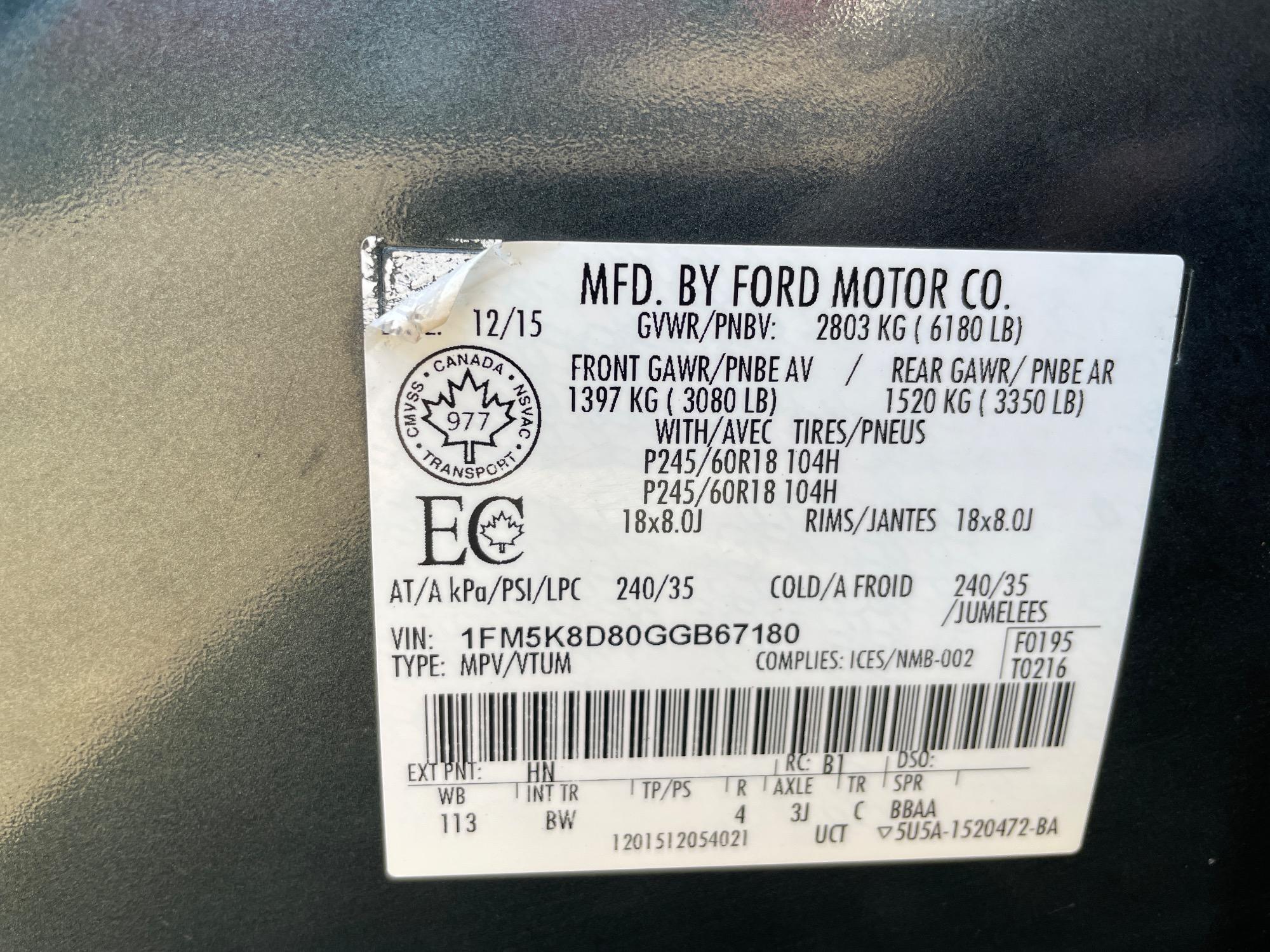 | VIN | 1FM5K8D80GGB67180 |