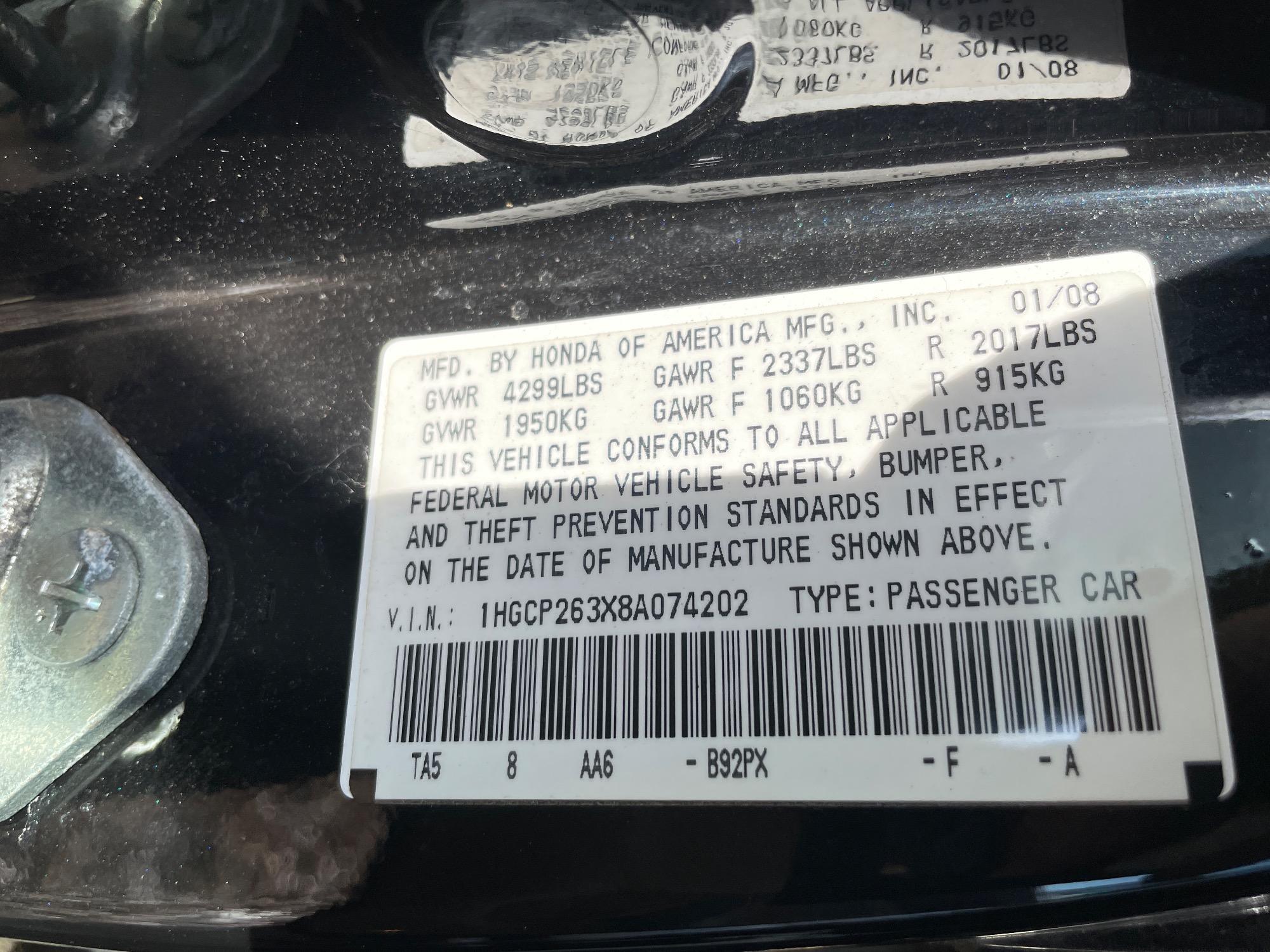 | VIN | 1HGCP263X8A074202 |