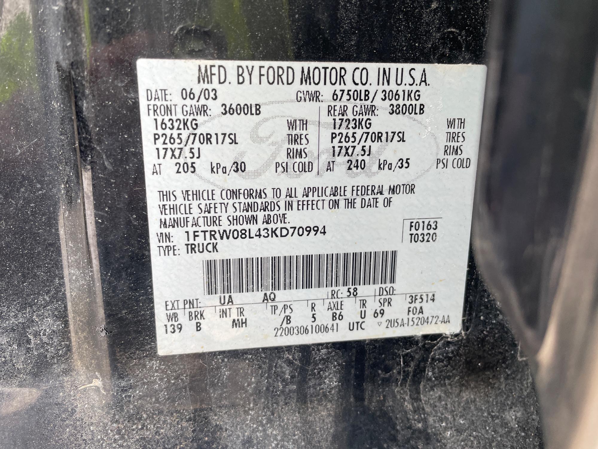 | VIN | 1FTRW08L43KD70994 |