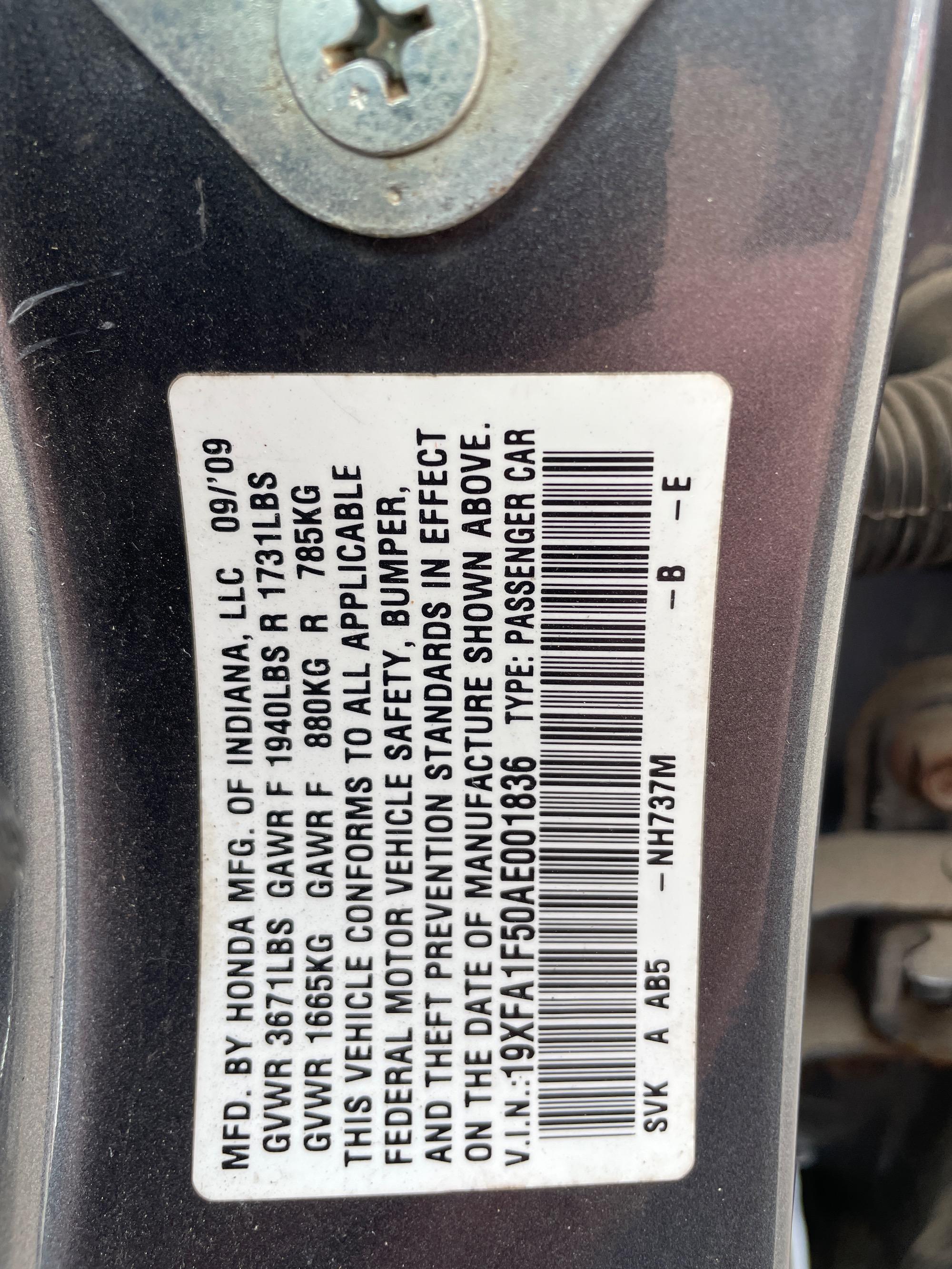 | VIN | 19XFA1F50AE001836 |