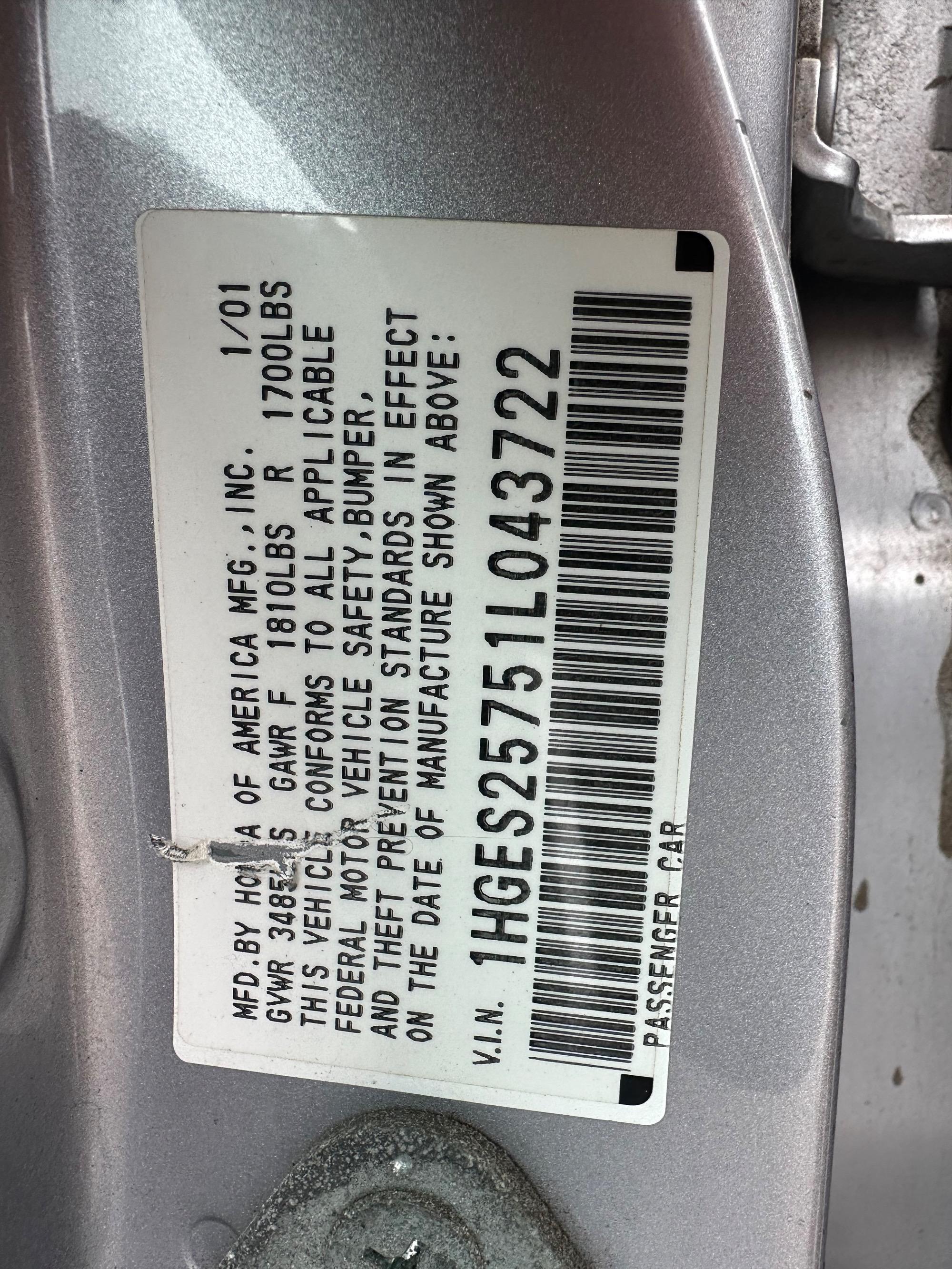 | VIN | 1HGES25751L043722 |