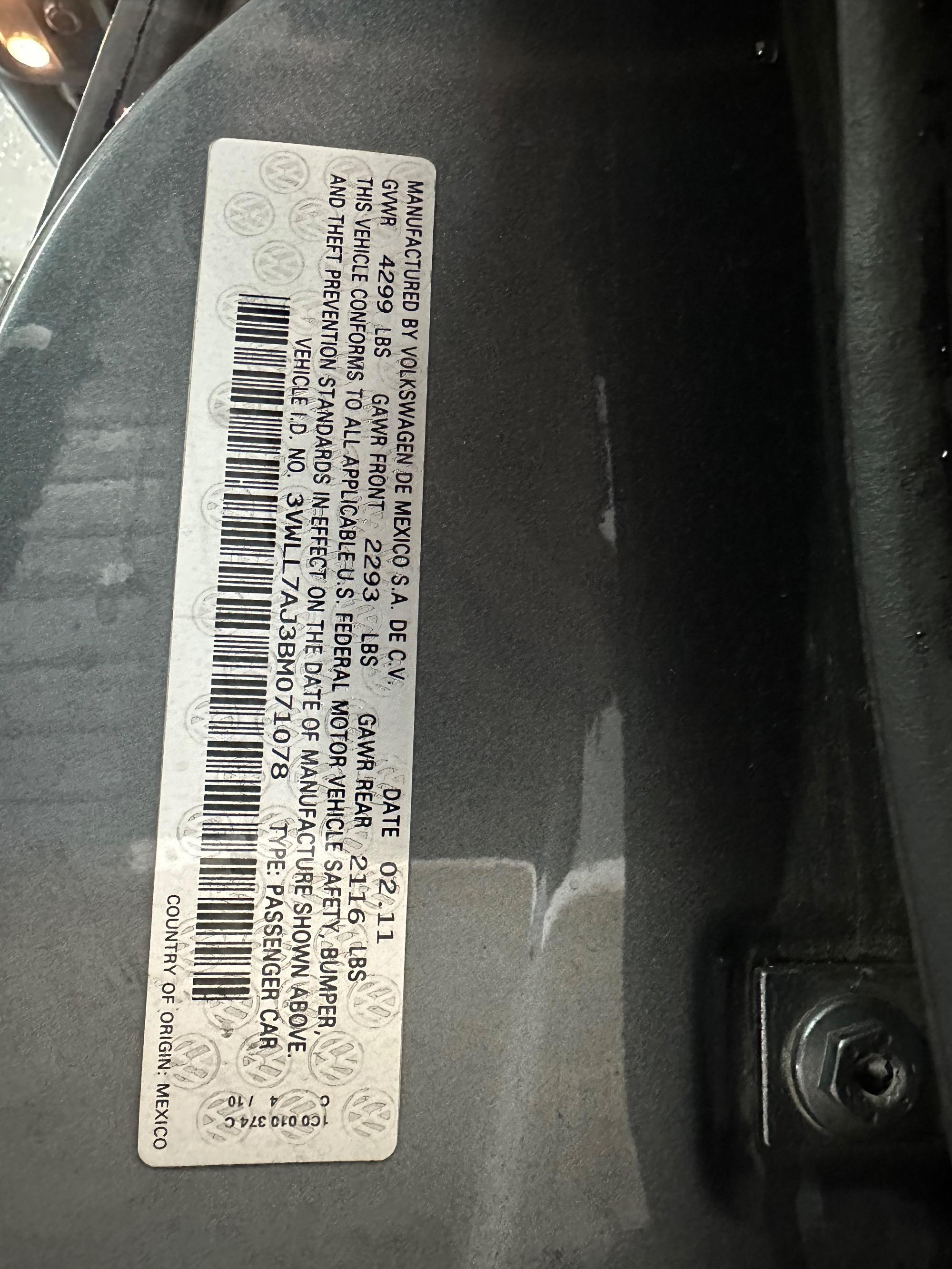 | VIN | 3VWLL7AJ3BM071078 |